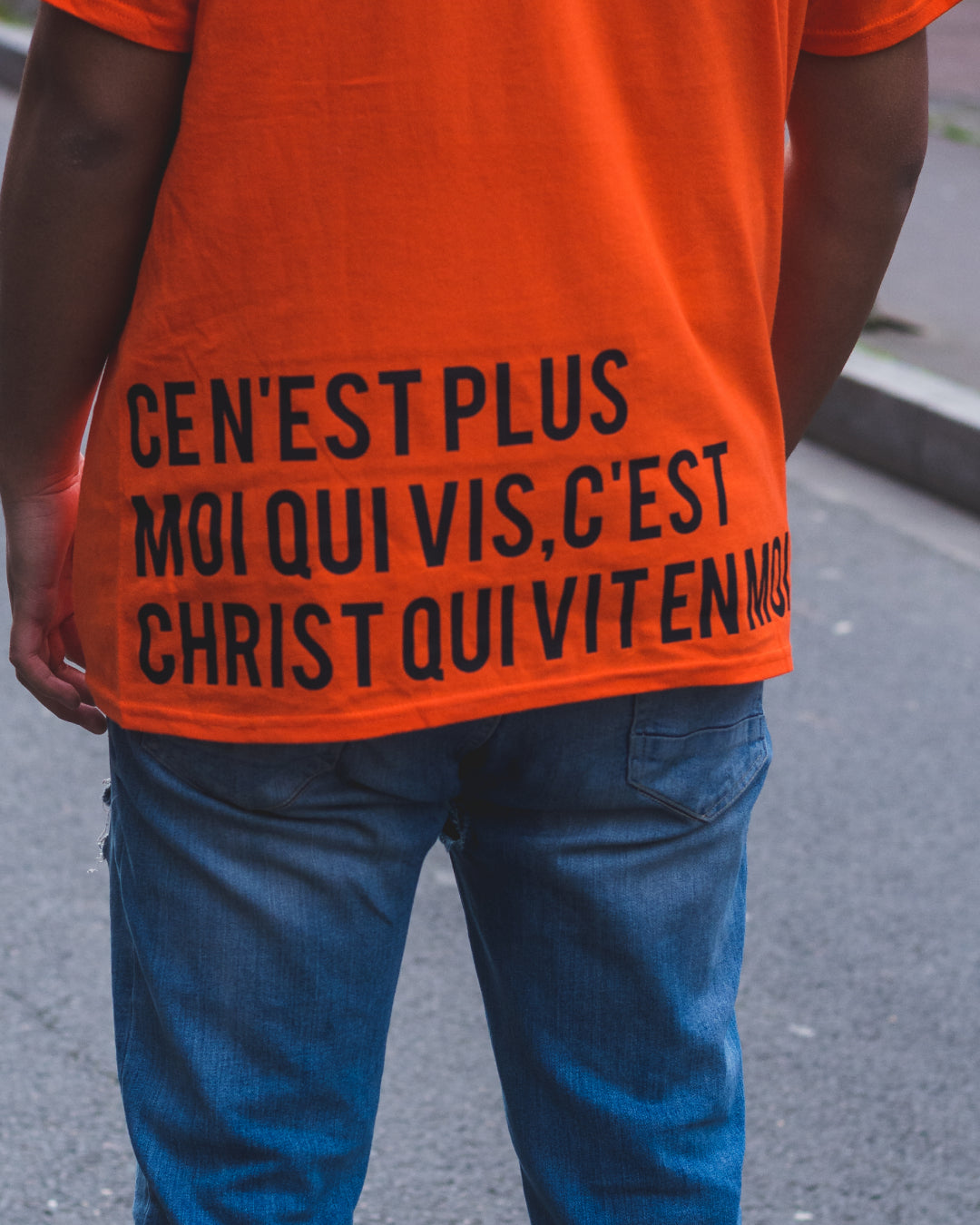 Le T-shirt orange vif Base , communique le cœur, la Base de l'état d'esprit d'une personne engagée avec Jésus. Marqué en bas à gauche sur le dos du tee-shirt, le message "Ce n'est plus moi qui vit, c'est Christ qui vit en moi" est original tant dans la couleur orange vif du tee-shirt que dans sa position. Une pièce intemporelle, de Base et audacieuse dans ton armoire.