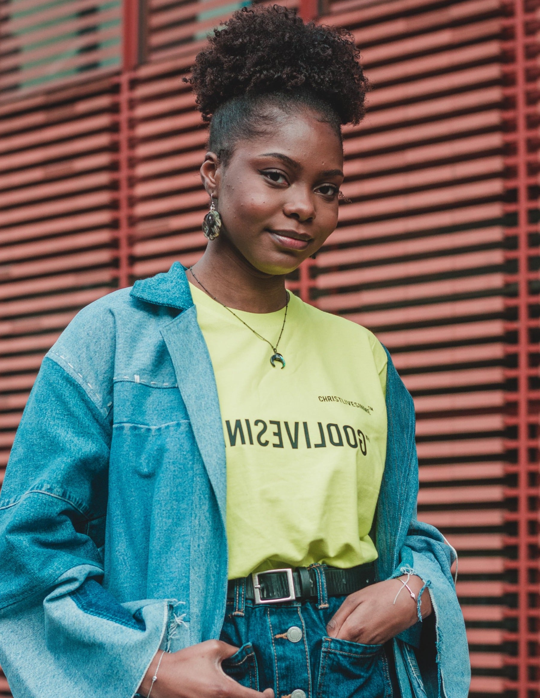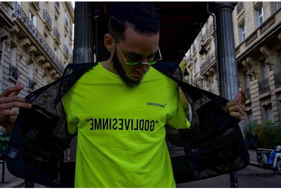 Le T-shirt jaune vif God lives in me, marqué à l'envers, est une des pièces de la collection Base de Christlivesinme.