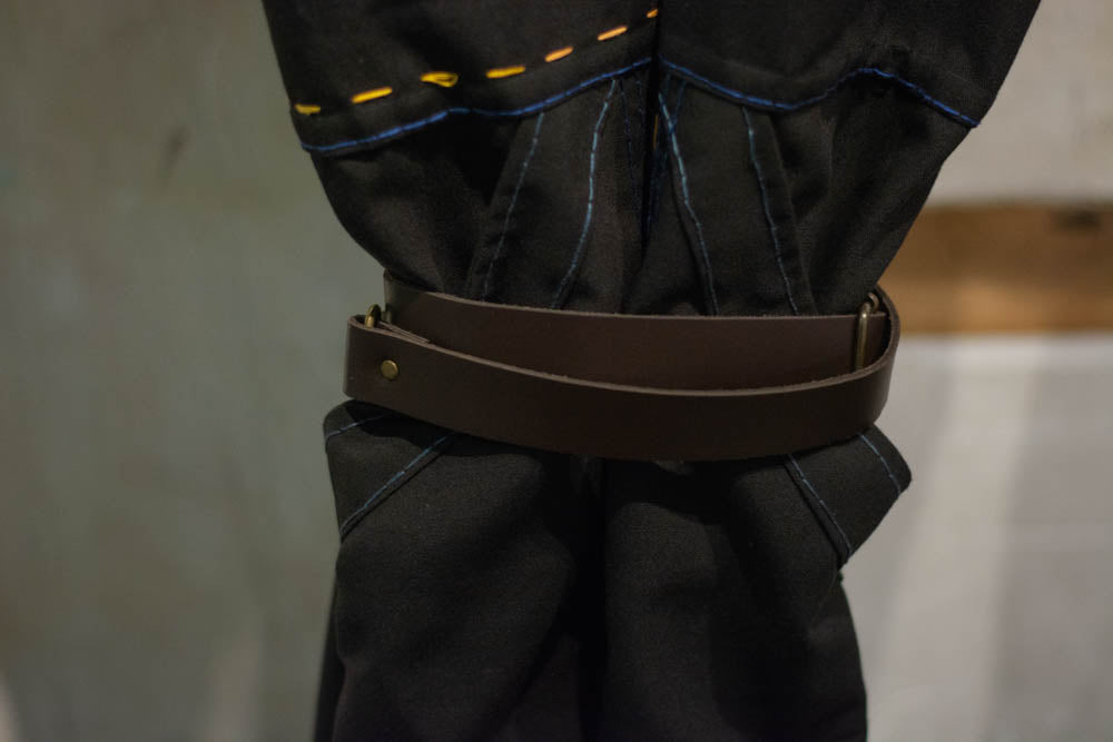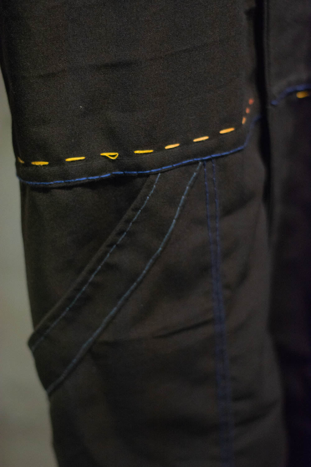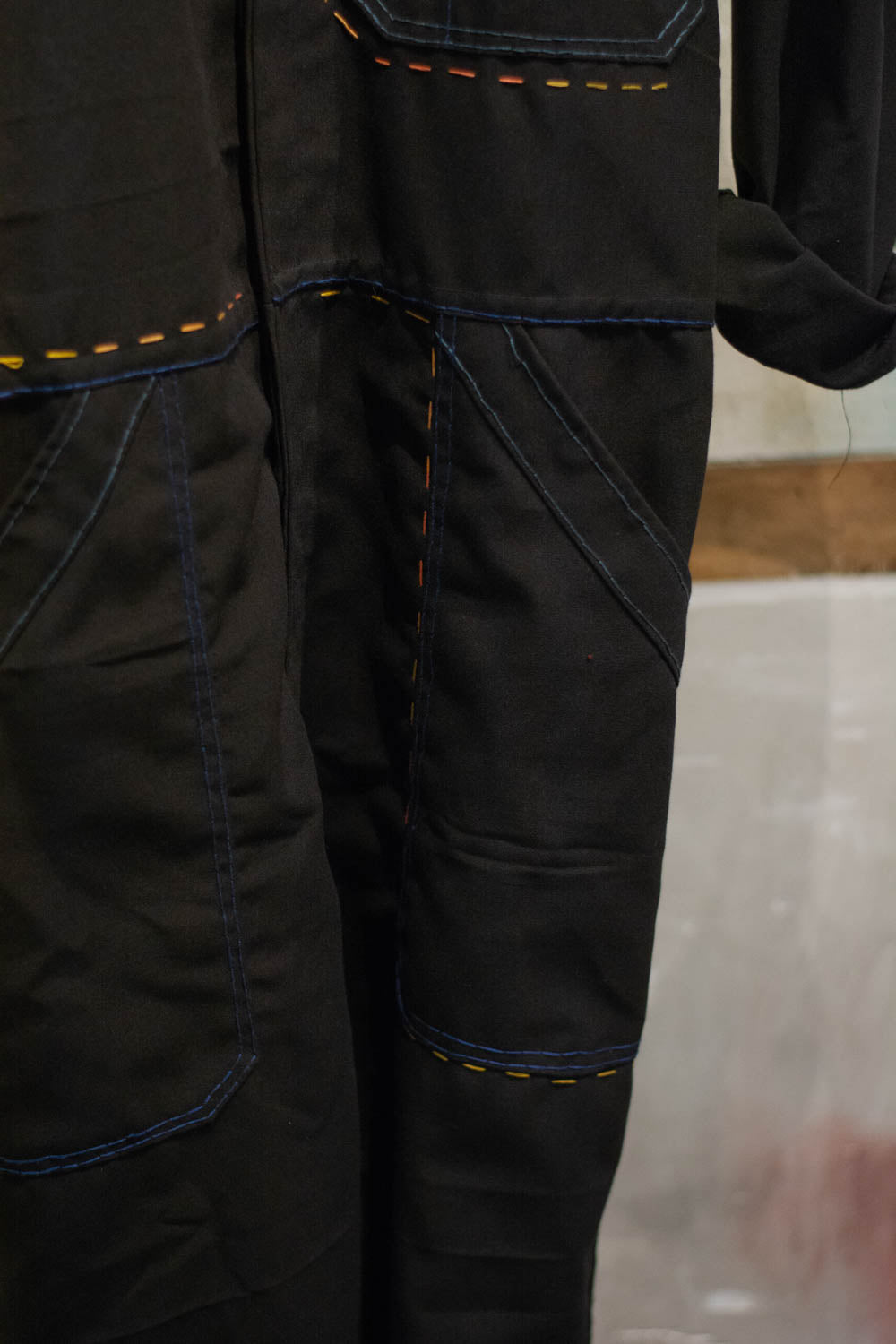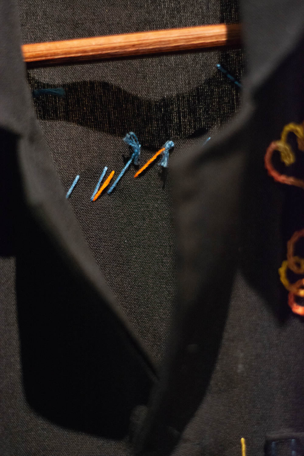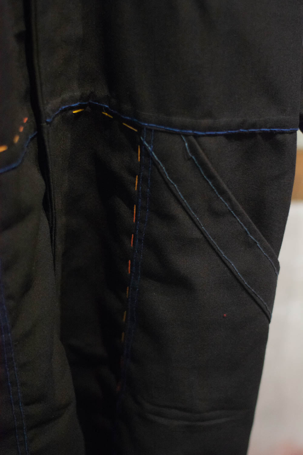 - Détail dos patch brodé sur un fond coton et cuir recyclé. Brodé avec du fil DMC