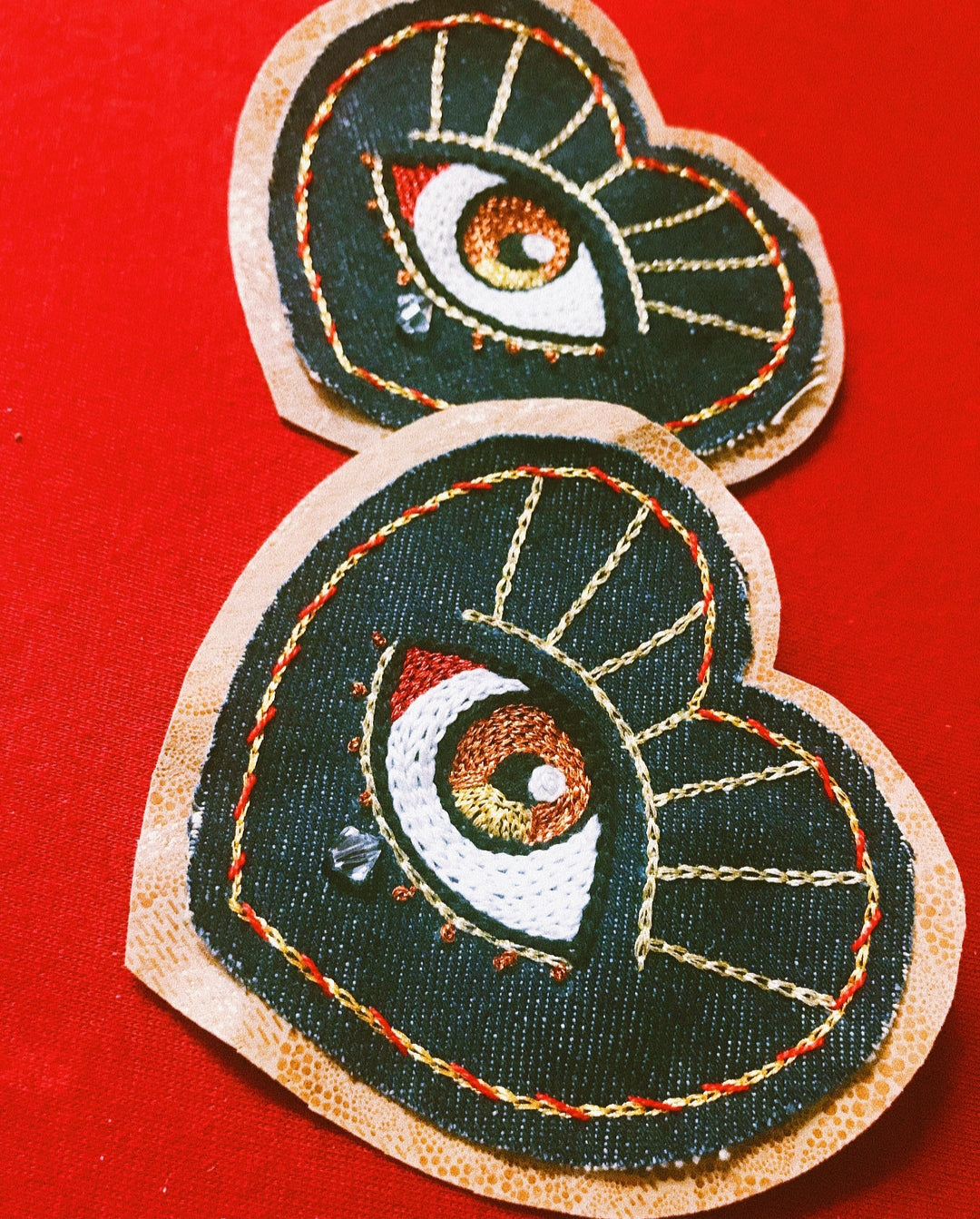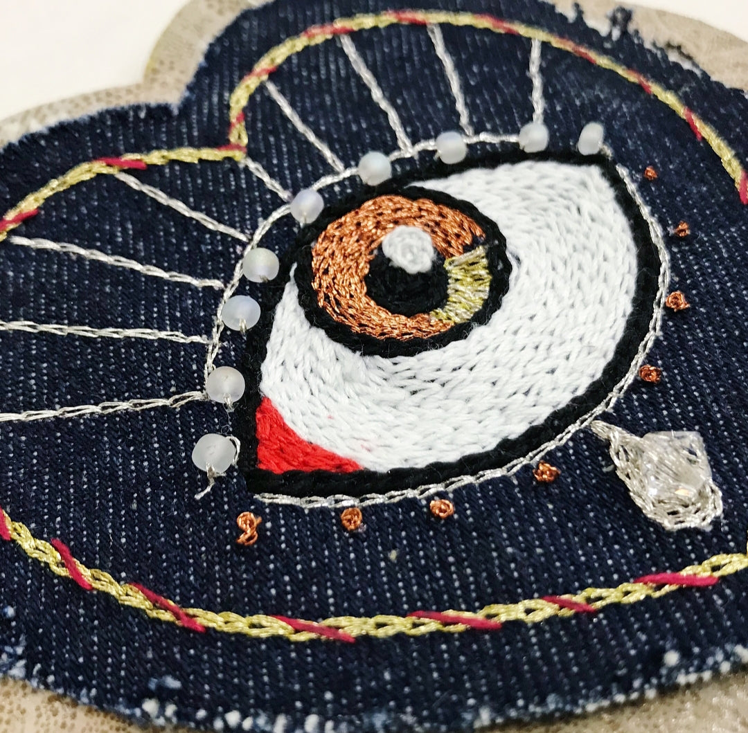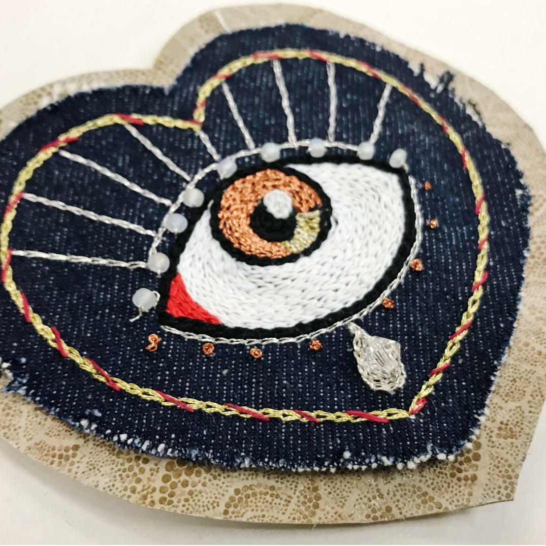 - Patch en coeur brodé à la main avec du Fils DMC 100% coton mouliné, métallisé, sur un denim recyclé et sur un fond en cuir recyclé
