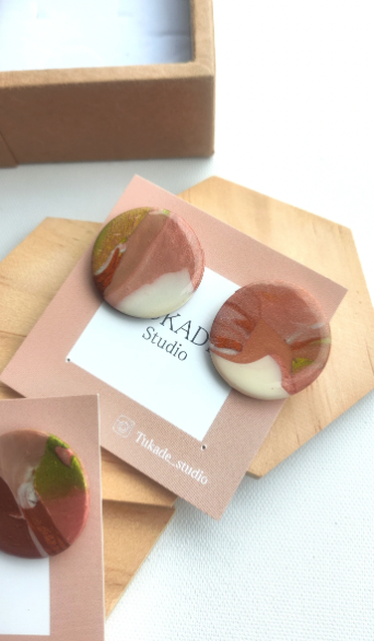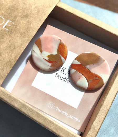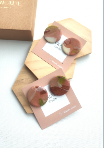 Chaque paire de boucles d'oreilles est fabriquée à la main avec beaucoup de soin et d'amour, suivant un processus créatif qui inclut le pétrissage, plusieurs cuissons, le ponçage et le polissage.